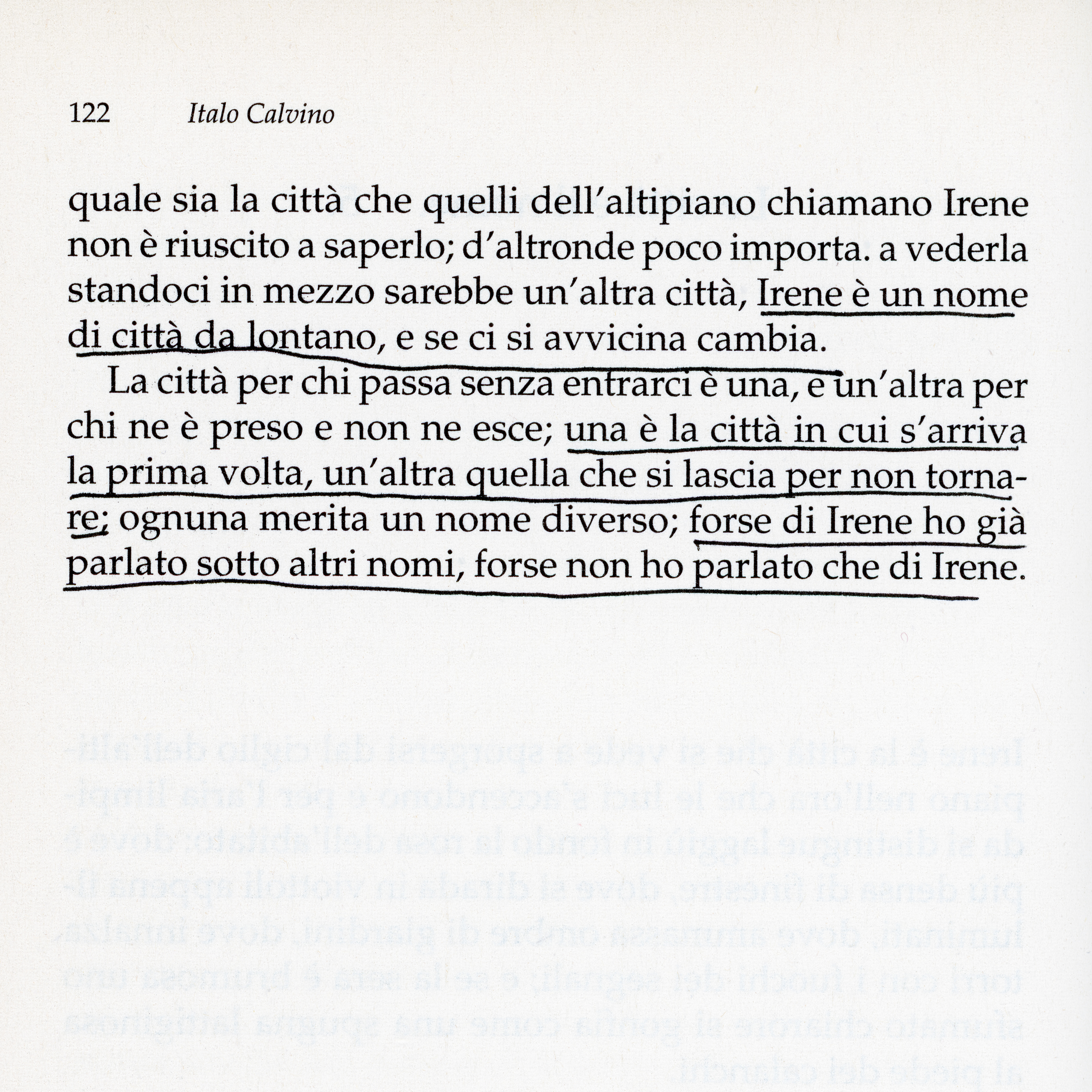 ¹ Irene is a name for a city in the distance, and if you approach, it changes. For those who pass it without entering, the city is one thing; it is another for those who are trapped by it and never leave. There is the city where you arrive for the first time; and there is another city which you leave never to return. Each deserves a different name; perhaps I have already spoken of Irene under other names; perhaps I have spoken only of Irene.